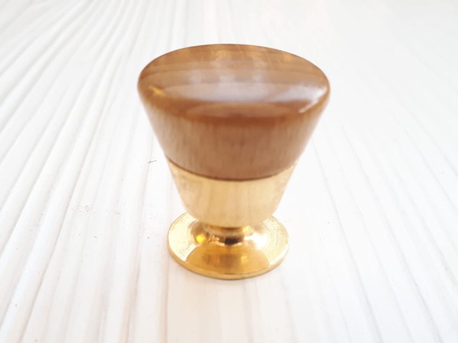 Pomello con base dorata o anche disponibile ramata, terminale in legno.