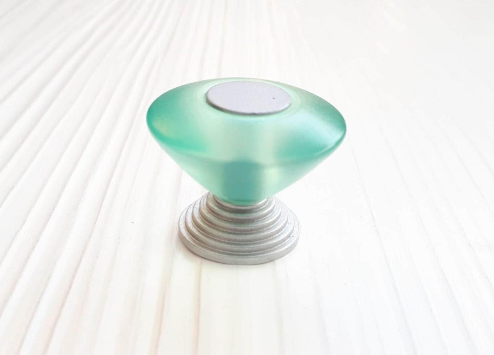 Pomello in opalino, base in ottone grigio argento, impugnatura in opalino verde. Diametro 30.