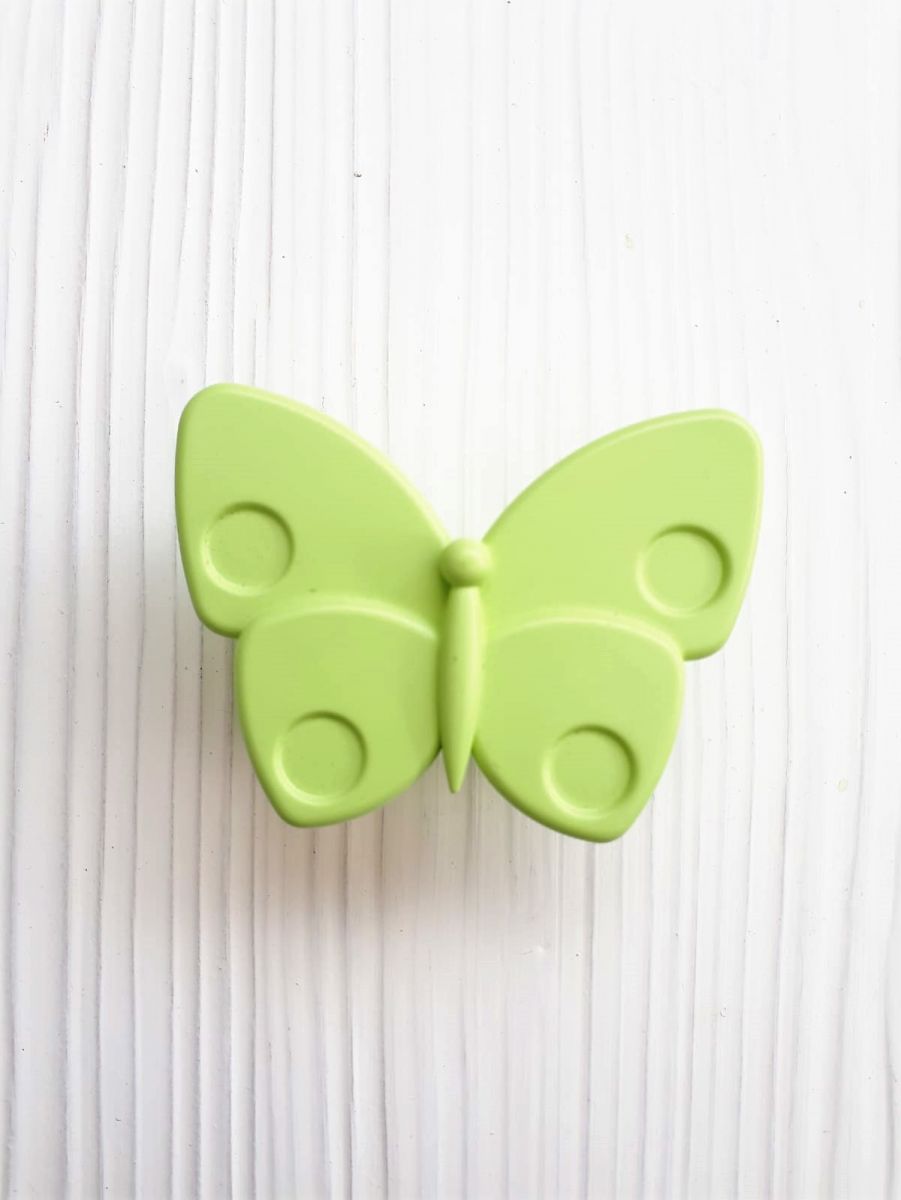 Pomolo a forma di farfalla verde acido, realizzato in plasica robusta. Larghezza massima 70.
