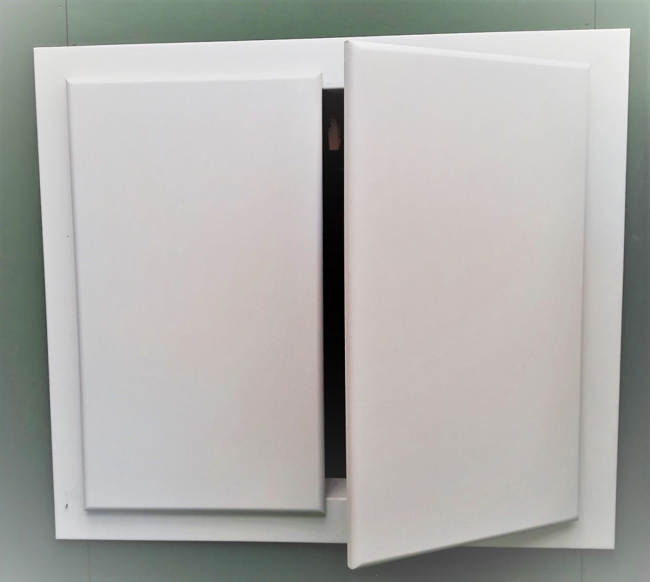 Sportelli a toppa in MDF light, telaio in listellare, copriflo in multistrato marino, cerniere Salice e finitura bianca.