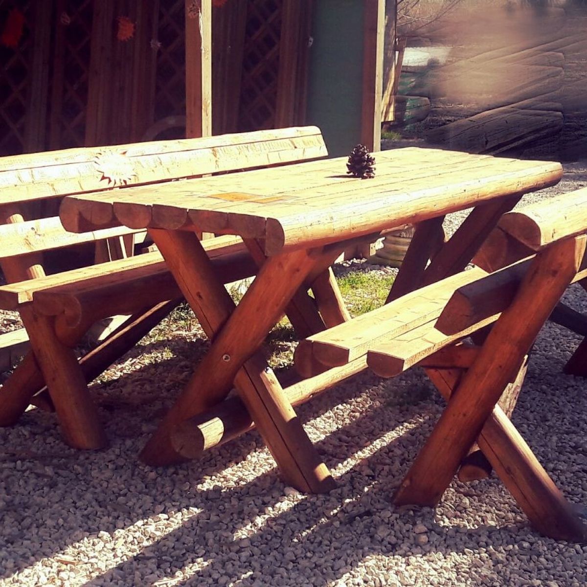 Tavolo completo di panche, creato con tronchi di abete.